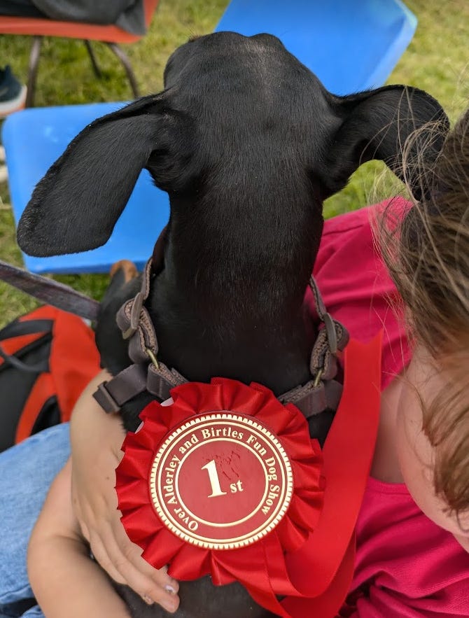 If you can take one more piece of exciting news, my dog won prettiest bitch in our local dog show this afternoon. Then she one-upped herself by winning Best in Show, despite breaking out in stress dandruff when she entered the show ring. She’s the cock of the walk. Good girl!